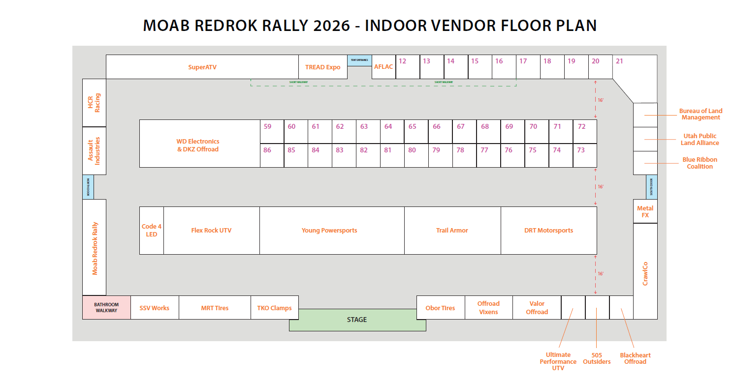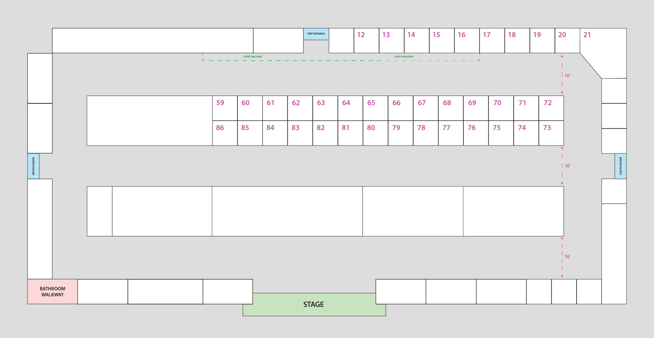 The 2025 event will be held at the Old Spanish Trail Arena.  Specific vendor booth and parking details will be communicated after registering for the event. The indoor and outdoor arena layouts below show the available booth slots and currently registered vendor locations.