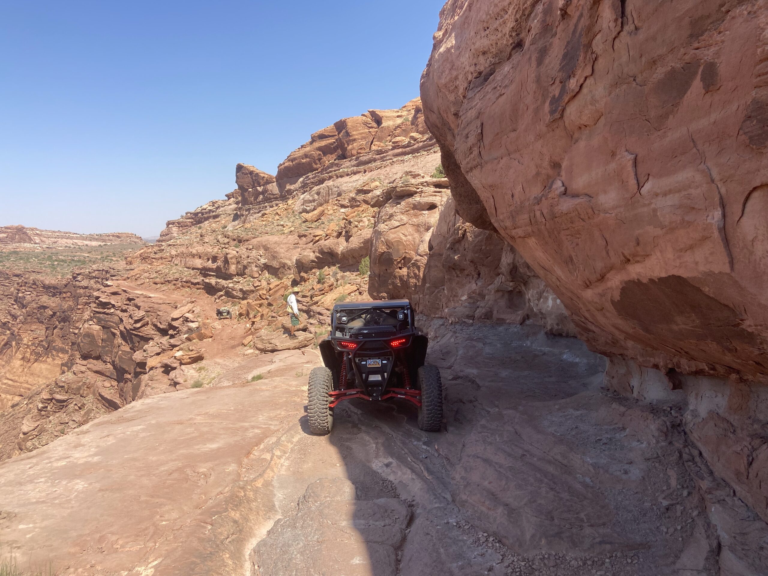 Trail consists of rock; sand and considerable slickrock with many steps exceeding 30″. Steep inclines and declines are prevalent. Enhanced off road equipment is required including, machine minimum 64″ wide, tall tires (33″+ required), onboard spare tie and axles, winch, maximized vehicle ground clearance and suspension travel. Roll over and vehicle damage possibilities exist.